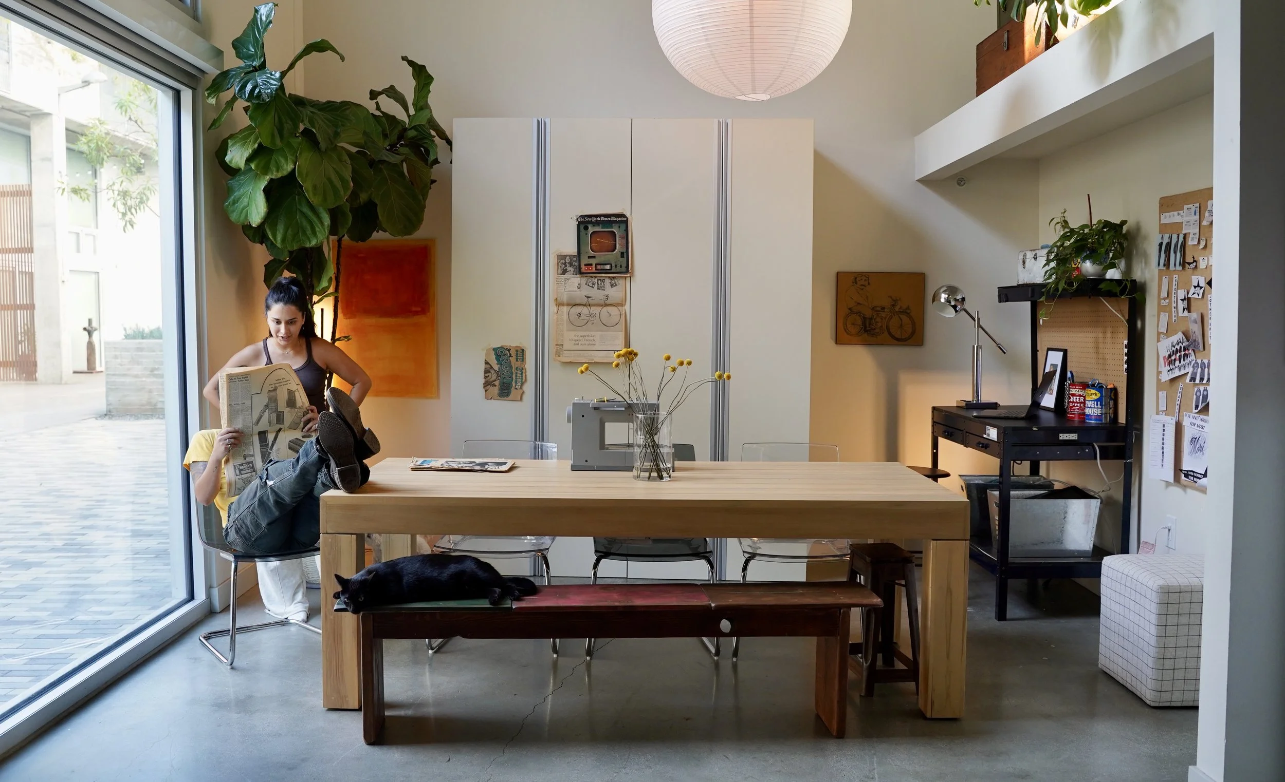 Reimagined loft space for creative co-working and hosting dinner parties. Industrial and midcentury themes dominated the design narrative.