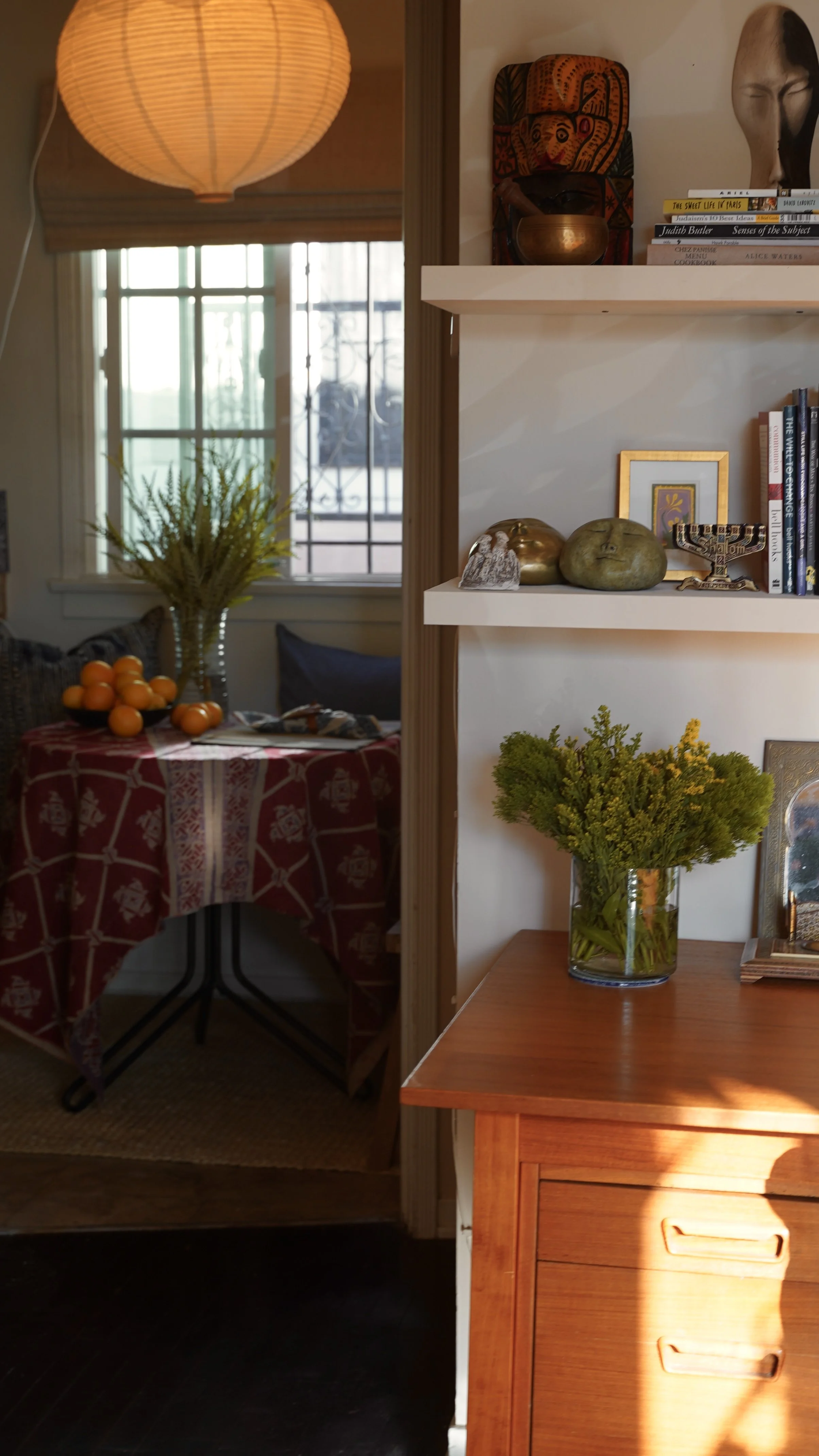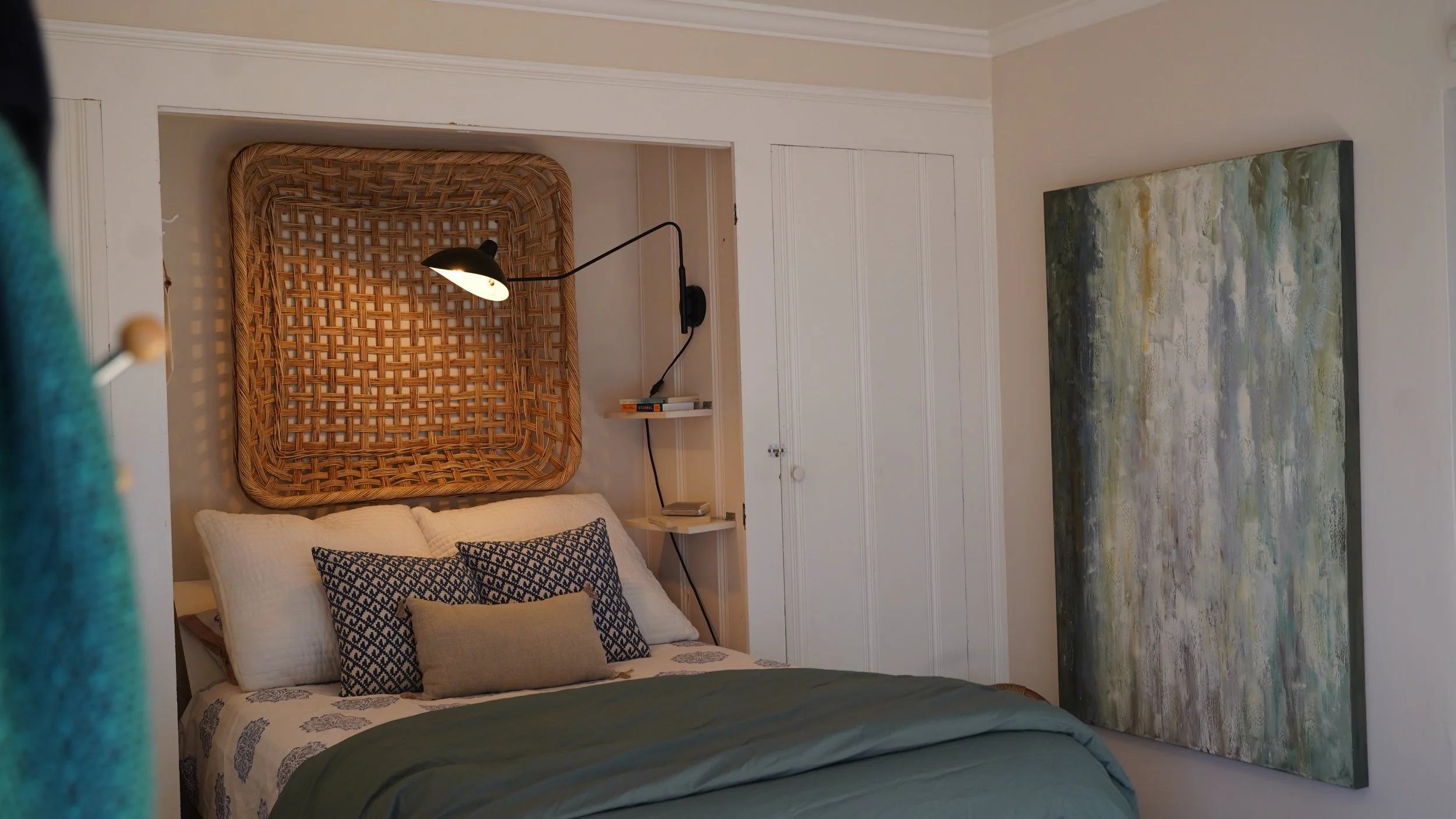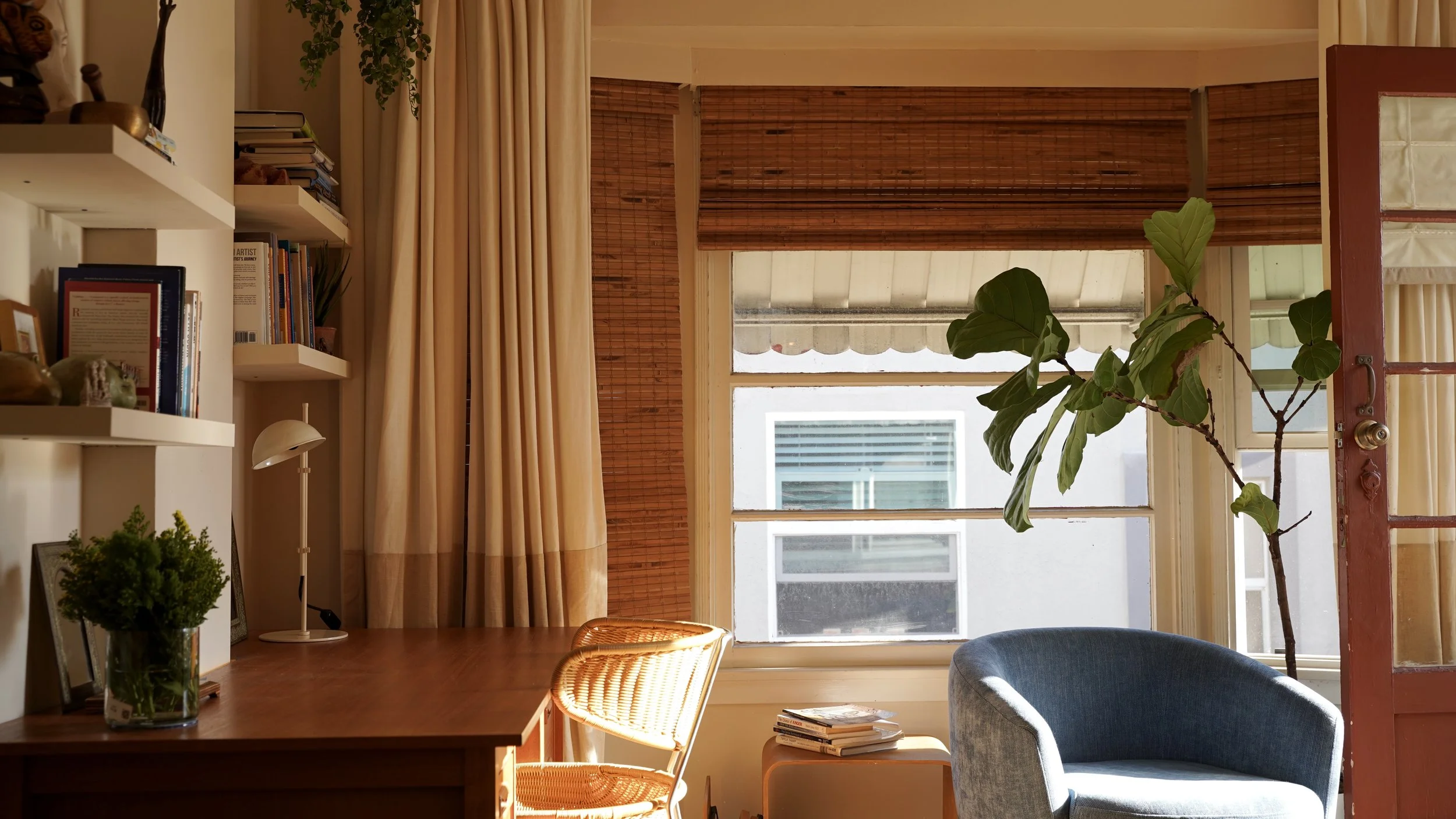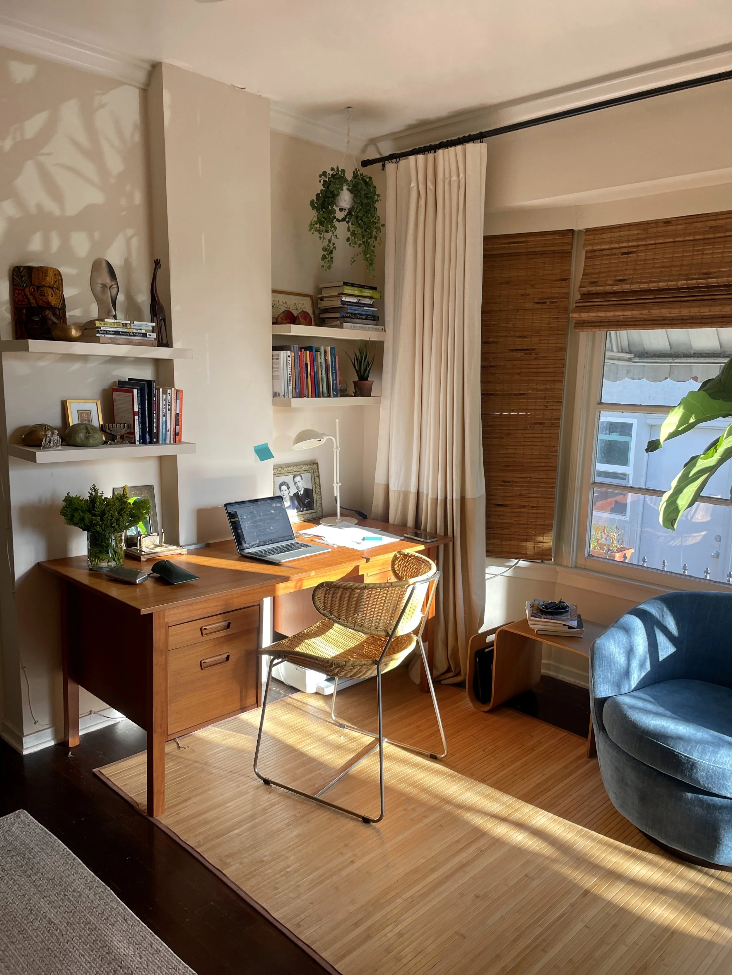 A Japandi-inspired urban oasis for a writer in Silverlake, Los Angeles. Natural textures and pops of blue and green characterized this design.