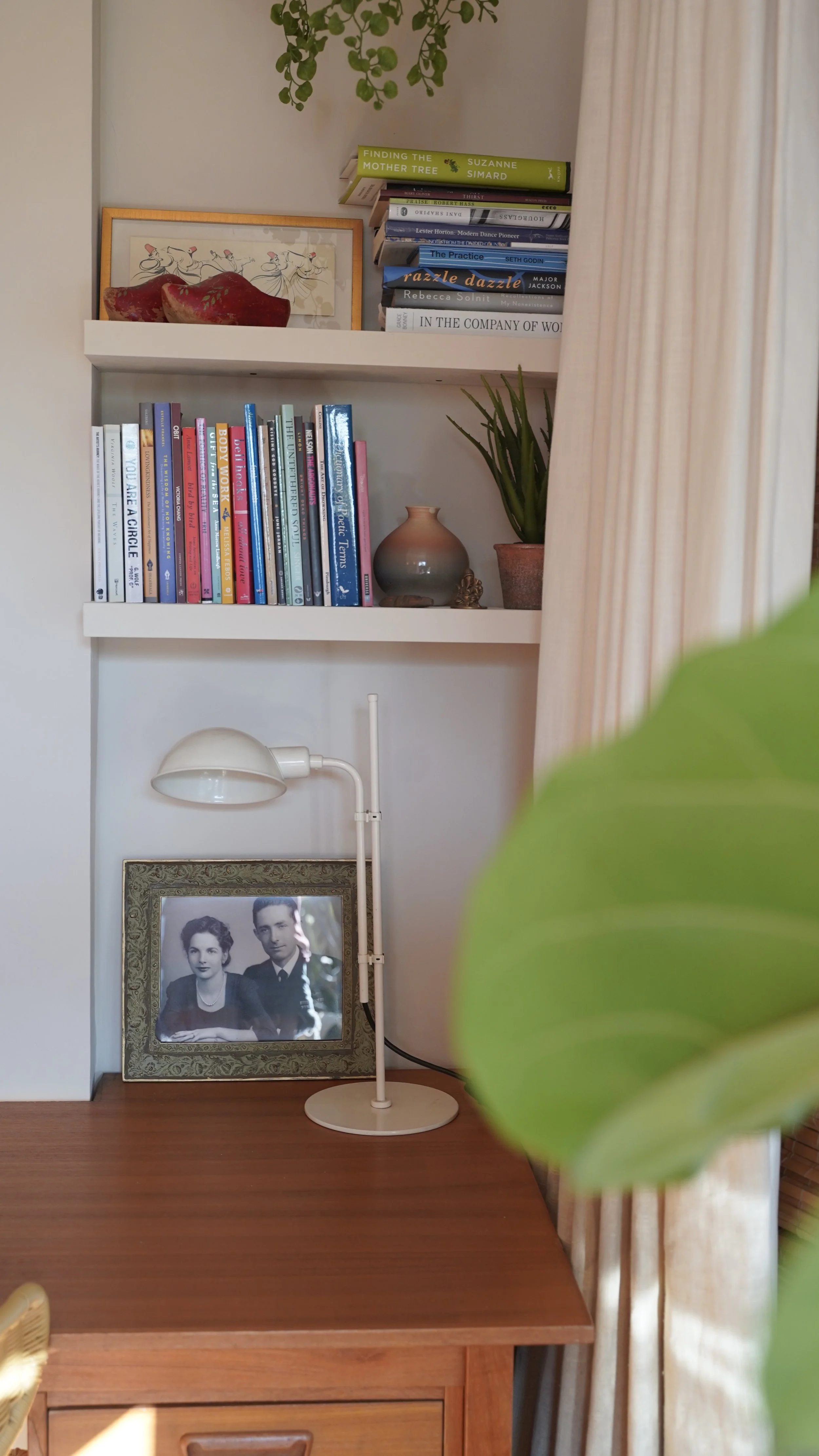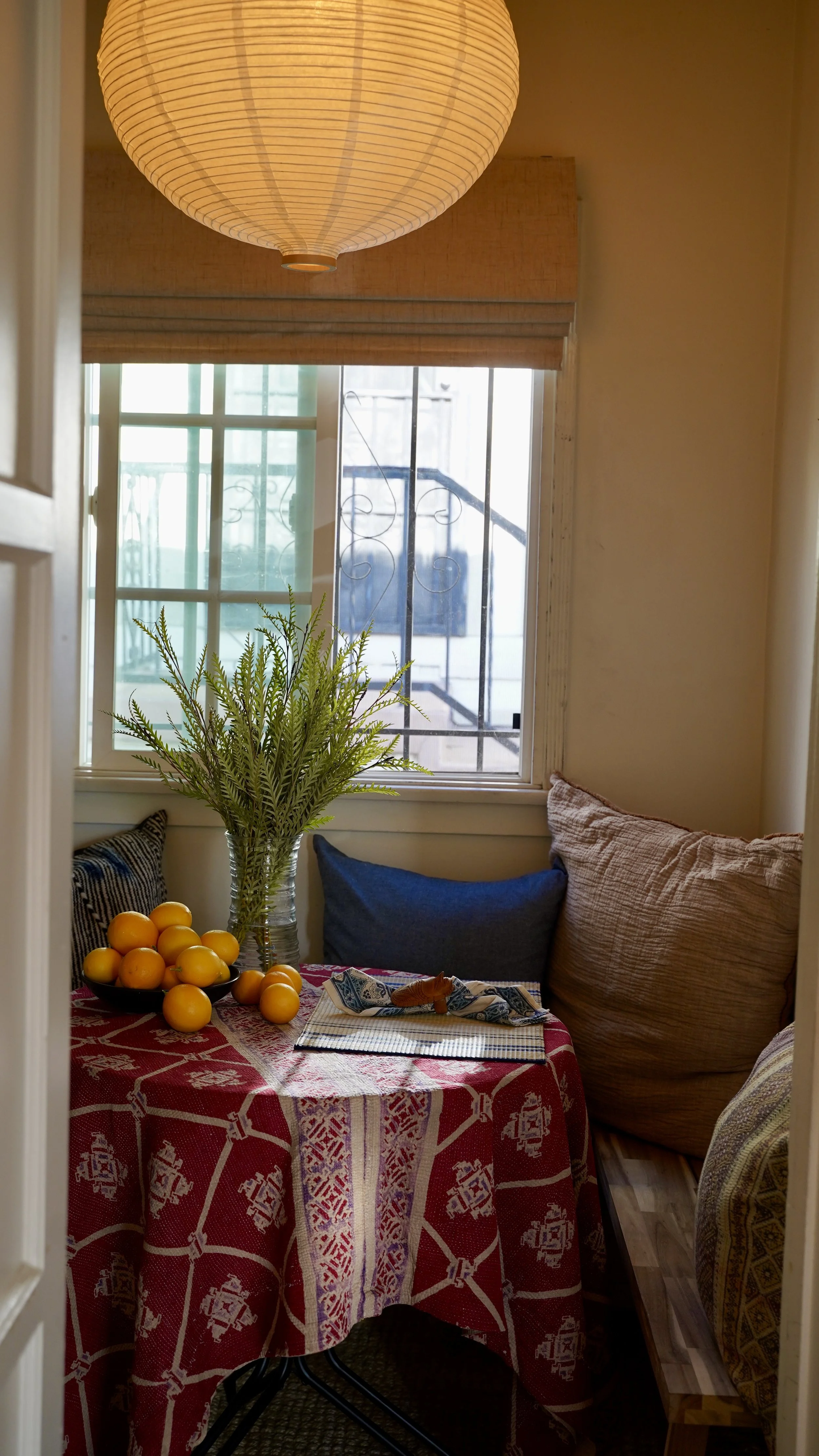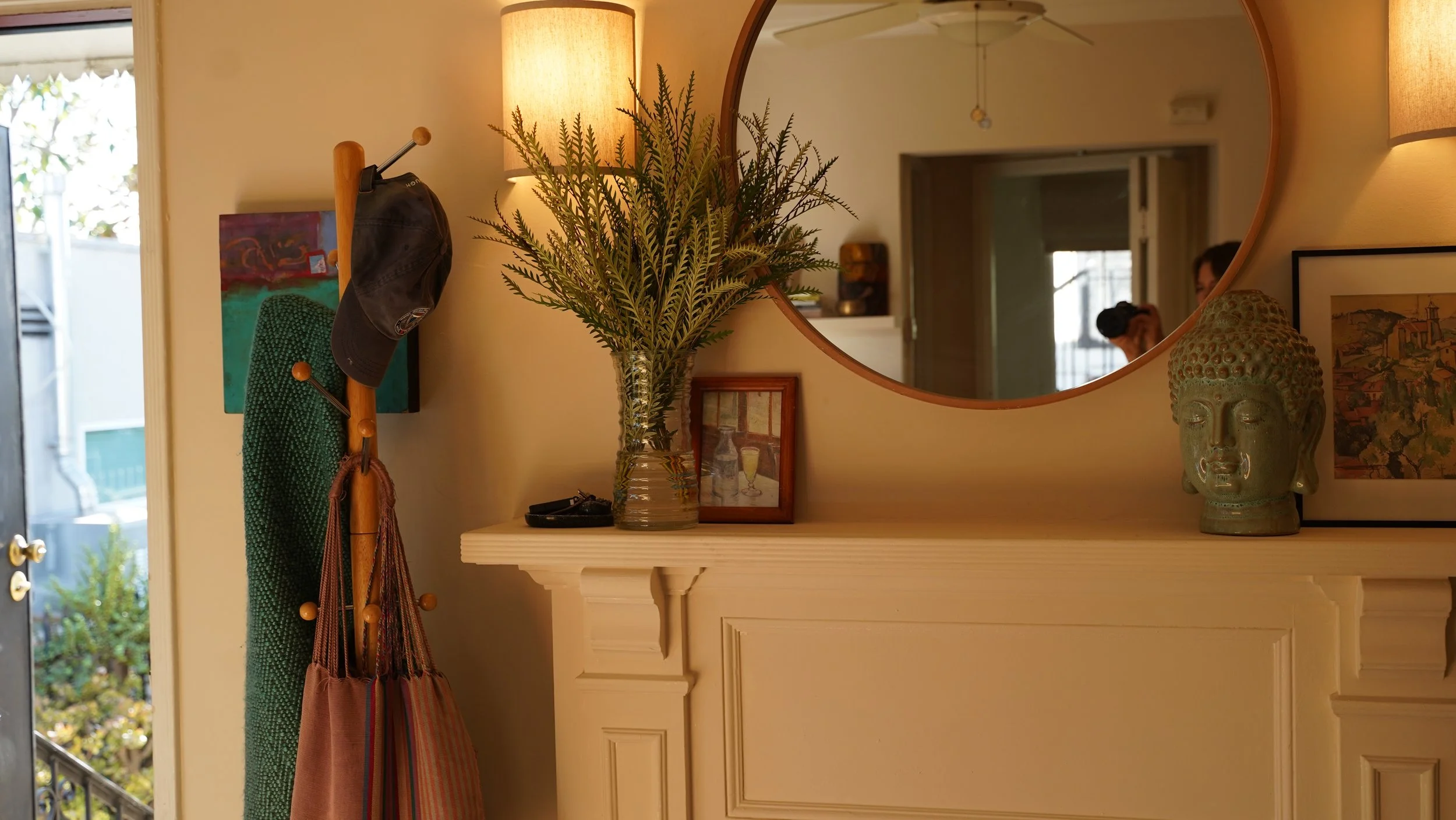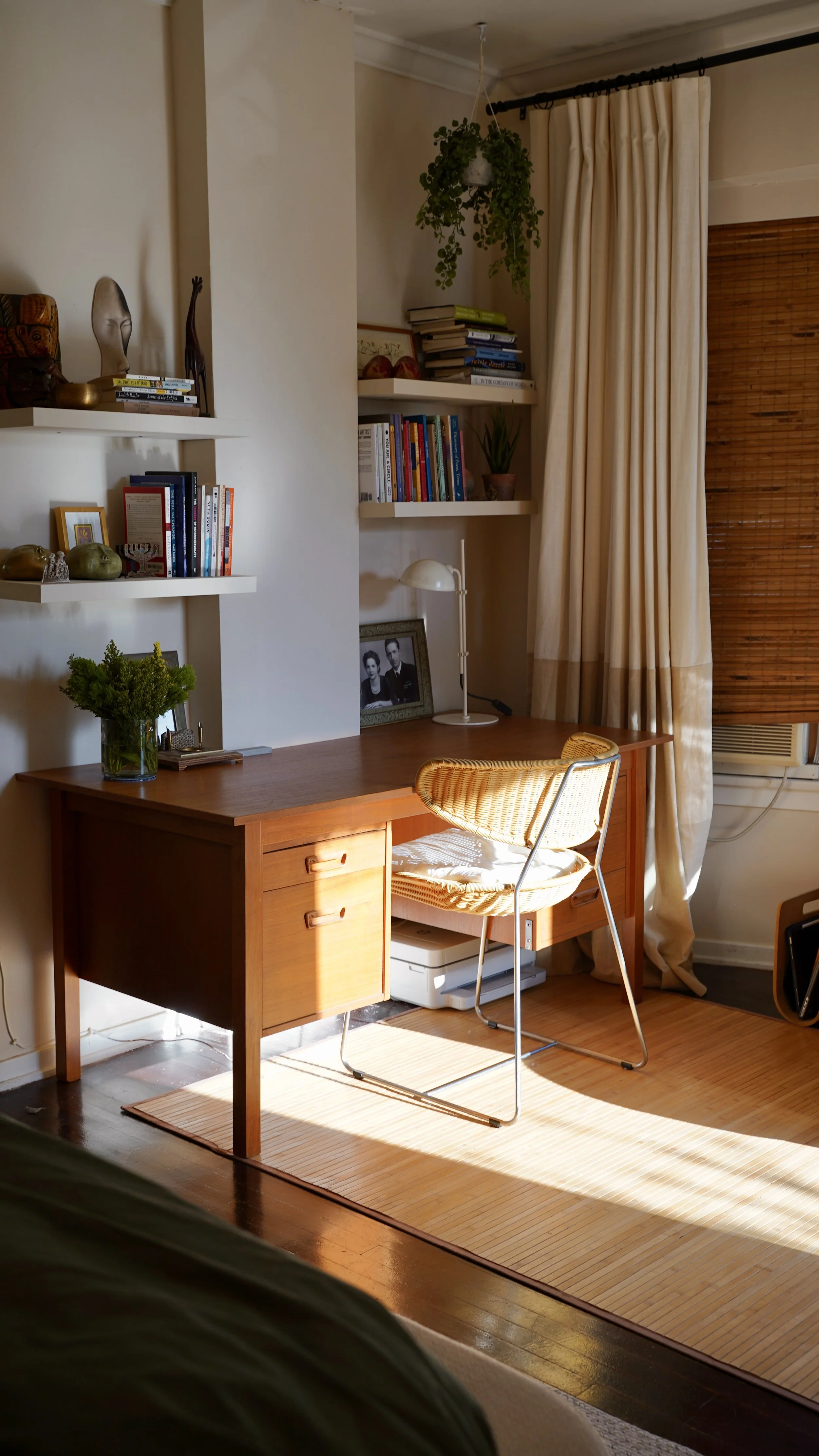A Japandi-inspired urban oasis for a writer in Silverlake, Los Angeles. Natural textures and pops of blue and green characterized this design.