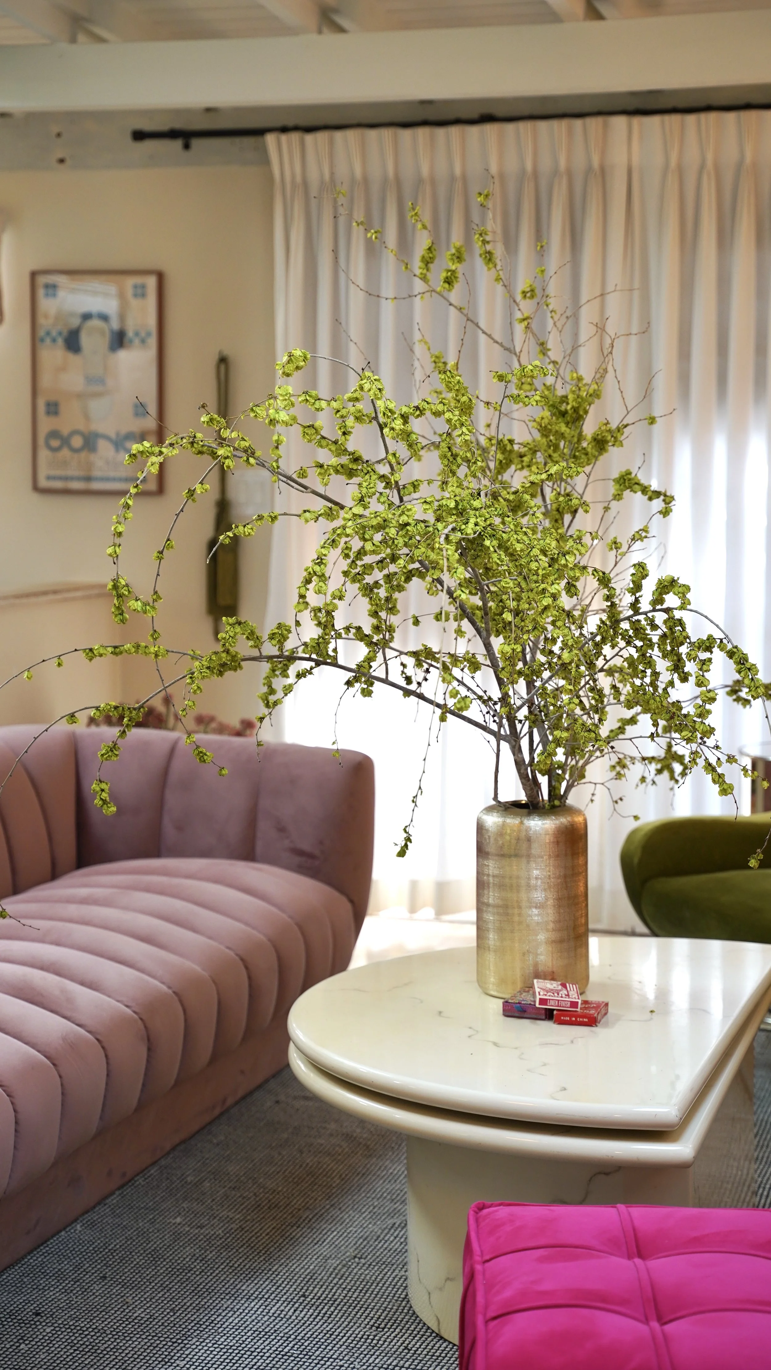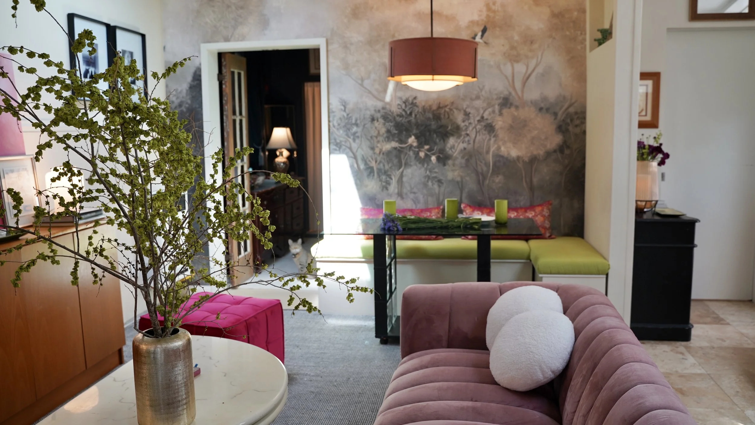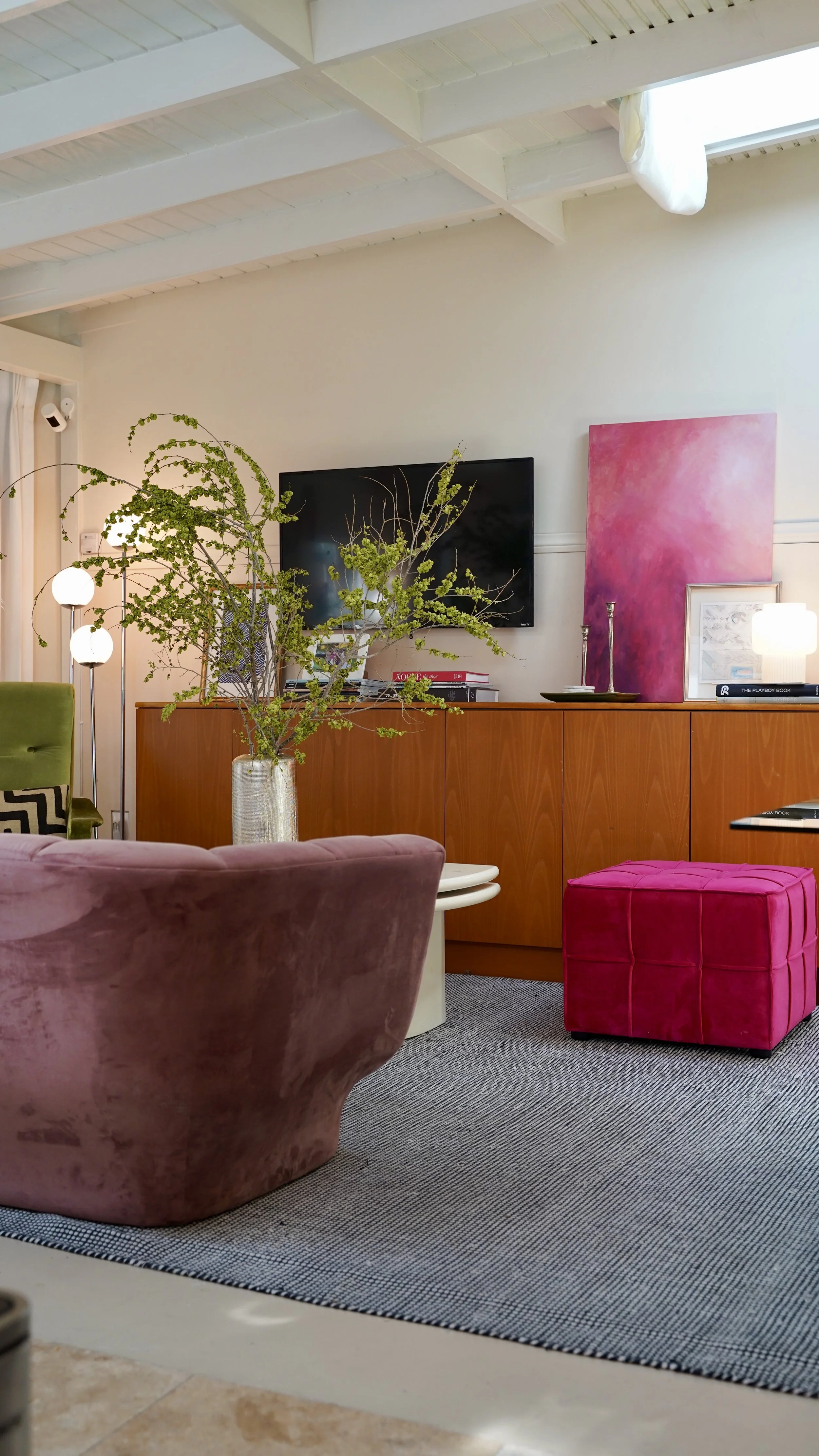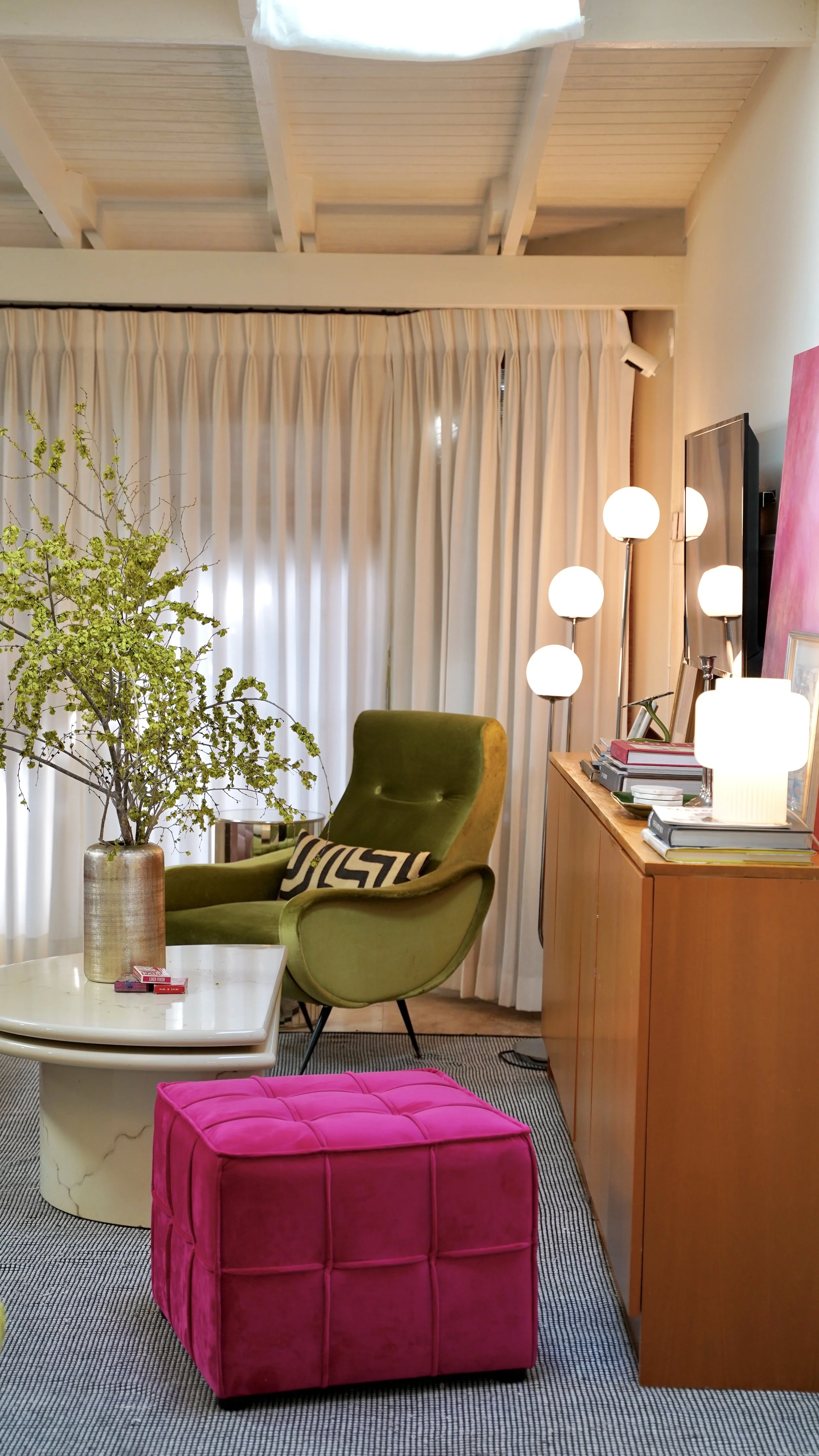 A colorful, bold, and retro Living-Dining Room set up in Beverly Hills, Los Angeles. Pink and green theme. Include more storage and flow.